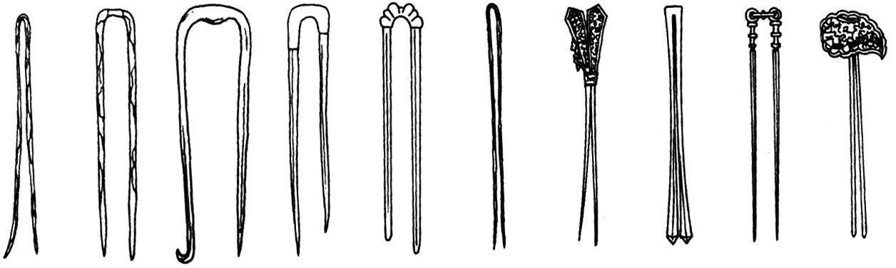 钗形制的演变 钗古代妇女首饰。用以固发髻或装饰。用时还可同步摇等饰物一起搭配,张仲素 《宫中乐》: “珠钗挂步摇” 即是。唐代妇人多行用钗,且数量较多,诗句有“金钗十二行”,意即一人戴十二钗。“十二”之数,只是言其多而已,故白居易《酬牛思黯》诗有“钟乳三千两,金钗十二行”之句。而罗虬《比红儿》诗“照耀金钗簇膩鬟”句观之,则一人戴许多钗于头上,更为显贵。古代制钗子的原料很多,有金、银、珠、玉、珊瑚、琥珀、水晶、玻璃等;雕饰有凤凰、鸳鸯、燕、雀、鹦鹉、蝉、蝶、鱼等。