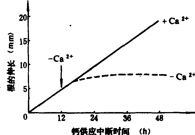 促进细胞伸长 钙是细胞伸长所必需。在外源Ca2+供应中断时,根的生长速率立即减低(图1),几天后根尖变为褐色,并逐渐死亡。缺钙时根系生长停止主要是由于抑制细胞伸长的结果。钙在细胞伸长中的作用可能是由于吲哚乙酸(IAA)活化质膜上ATP酶,刺激H+向质外体泵出,降低质膜外的pH值,因此大大提高细胞壁的弹性和可塑性,使细胞壁变松,促进细胞伸长,这一过程需要有外源Ca2+存在。