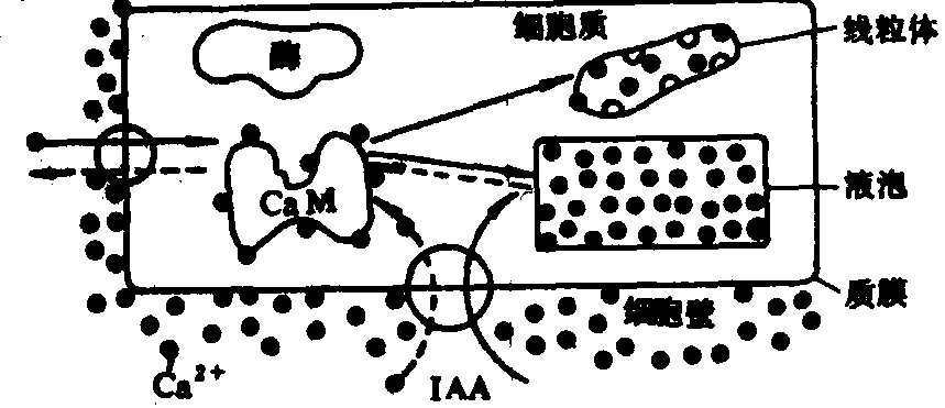 图2 由钙调素(CaM)和生长素(IAA)调节细胞质内钙的浓度的模式