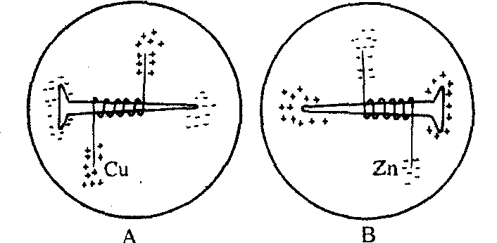 铁钉的电化学反应 静置一昼夜之后可以发现: 在培养皿A中,铁钉的两端出现蓝色,而铜丝的两端出现红色; 在培养皿B中,铁钉的两端出现红色,而锌条的两端出现棕色,现象十分鲜明。解释: ❶在两个培养皿中分别发生不同的电化学腐蚀。 ❷在培养皿A中铁钉和铜丝组成了原电池,发生铁钉的吸氧腐蚀。铁钉作负极发生反应: Fe-2e→Fe2+,Fe2+与铁氰根离子结合成蓝色沉淀,其反应式为 3Fe2++2[Fe(CN)6]3-=Fe3[Fe(CN)6]2↓ 铜丝作正极发生反应2H2O+O2+4e→4OH- 所产生的OH-在铜丝两端使酚酞呈红色。 ❸在培养皿B中发生了锌条的吸氧腐蚀,锌条作负极发生反应 Zn-2e→Zn2+ Zn2+与铁氰根离子结合成棕黄色沉淀 3Zn2++2[Fe(CN)6]3-=Zn3[Fe(CN)6]2↓ 此时铁钉作正极发生反应:2H2O+O2+4e→4OH- 所产生的OH-在铁钉两端使酚酞呈红色。 |