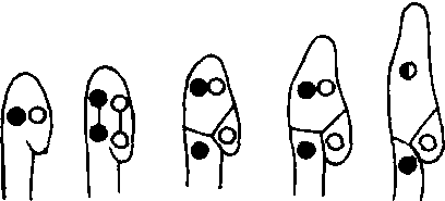 | 释义 | 钩状结合hook combination高等子囊菌(如火丝菌Pyronema confluens)产囊丝顶端细胞双核并裂的方式。来自雌雄两亲本的两个核在产囊丝中的一个双核细胞伸长而弯下来形成一个钩状体(hook,crozier),细胞内同步分裂,形成四个核,两个来源不同的核位于钩状细胞弯曲顶部,一个留在钩状细胞底部,另一个进入钩端。之后在钩状细胞中形成隔膜,将此细胞分隔成三个细胞,在弯曲顶端细胞内的两个核可进行核配,形成子囊母细胞,最终形成子囊。下面的两个细胞可融合形成一个双核细胞。此双核细胞又可作为产囊丝顶端细胞经上述过程产生出新的子囊母细胞。