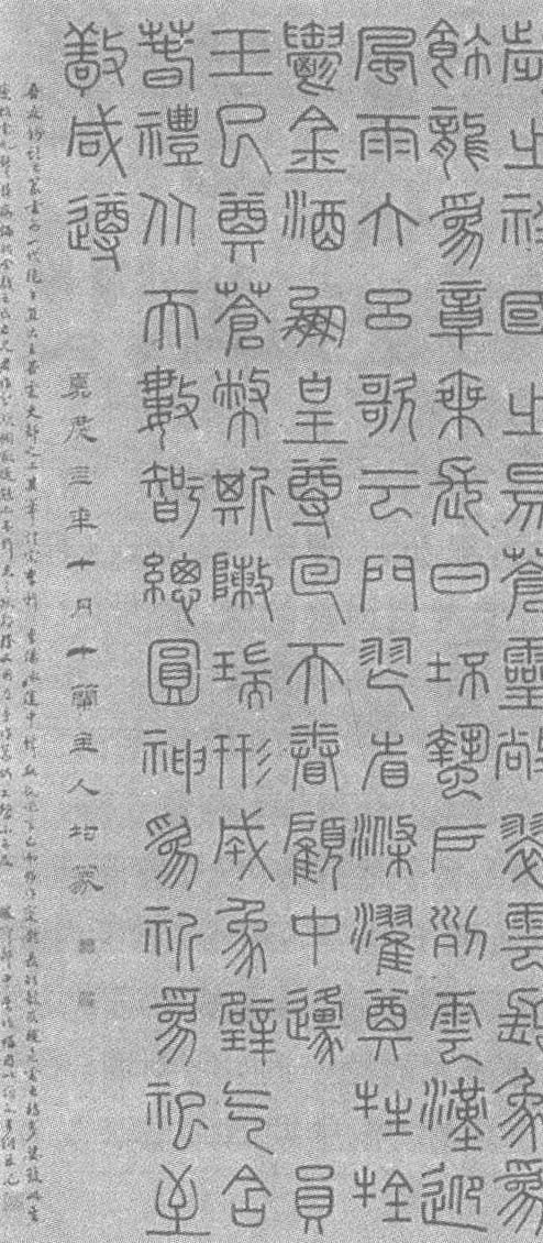 | 释义 | 钱坫篆书文摘轴清。纸本。纵125厘米,横57.4厘米。北京故宫博物院藏。钱坫(清乾隆九年—清嘉庆十一年,即公元1744—1806年),字献之,号十兰,江苏嘉定(今属上海市)人。乾隆三十九年(公元1774年)副榜。累官知乾州,兼署武功县。工小篆,直接李阳冰、徐铉。晚年右体偏枯,左手作篆尤精绝,名动当代。擅铁笔。工墨梅,精通文字及考据之学,有多种著作传世。此幅篆书,写于嘉庆四年(公元1799年)属晚年病中之作。中锋悬腕运笔,匀整而沉着。不拘泥古人,在结构上多有变化,长短欹仄,随意书之,并参以金文的特点,更有一种继承和创新的独特风貌,是钱坫篆书代表作品。