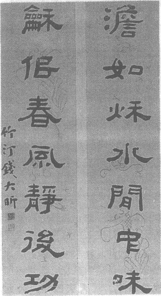 | 释义 | 钱大昕隶书七言联清。纸本。纵118厘米,横30厘米。吉林省博物馆藏。钱大昕(清雍正六年—嘉庆九年,即公元1728—1804年),字及之,一字晓征,号辛楣,又号竹汀,江苏嘉定(今属上海市)人。嘉庆十九年进士,官至少詹事。精通经史百家、天算地舆,尤善考证,精金石小学,善隶书,是乾嘉学派的重要学者之一。清蒋宝龄云:“竹汀博于金石,《墨林今话》尤精汉隶。”著有《潜研堂集》。此七言联“澹如秋水闲中味,和似春风静后功。”款署:“竹汀钱大昕。”款下钤白文:〈钱大昕印〉、朱文:〈辛楣〉两印。隶书古茂浑朴,饶有韵致,上联“水”字字画较简,故钱氏有意将下联对应的“风”字处理成古文写法,使之复杂对应,全书上下联文字轻重变化,参差错落相应。字体宽博,清秀俊雅,意态高纵,汉碑中雄强刚健的气度跃然于纸上。