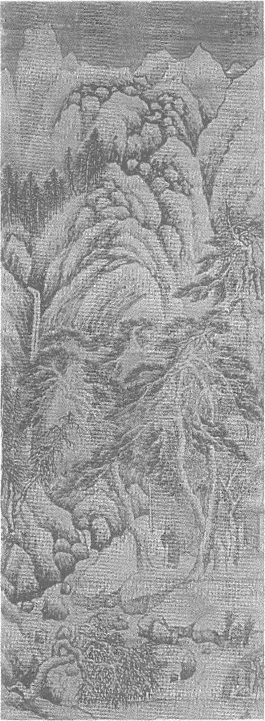 | 释义 | 钱榖晴雪长松图轴明。钱榖绘。纸本设色。纵271.6厘米,横100.3厘米。北京故宫博物院藏。钱榖(公元1508—1578年),字叔宝,号罄室,江苏苏州人。少年孤贫失学,成年时从文徵明习诗文书画,晚年涉猎吴镇、沈周等家,山水笔墨疏朗雄健,山水画酷似文徵明。也能画人物、兰竹,兰竹意趣古淡,爽朗清新。喜好读书,善书法,喜欢亲自抄写古书,曾手抄稀见书籍,所录古文金石书达数万卷,有《三国类钞》等传世。编有《续吴都文粹》等。此图绘雪后山中的景致。峰峦叠嶂,山势险峻。山坳间,林木错落有致,飞瀑高悬,犹如白练。近景,在山麓平坡上,长松挺拔伟岸,枝叶繁茂。高松下掩映竹篱茅屋,前临溪水,水流湍急,一些碎石散落在溪水之中,岸边的树木垂至溪中。一文人头戴儒巾、身着长衫、双手拄竹杖在屋前长松下临溪伫立,似在赏景,表情悠闲,一童子在旁侍立。溪上木桥横卧,一樵夫正肩担柴禾从桥上走过,极富生活气息。意境清幽,构图严密,设色淡逸清爽。山峦坡石及树木留表以示积雪。远山以勾线染色为主,山峦坡石用笔粗简,而松针细致,笔墨疏朗雄健。右上自题篆书:“流泉依细石,晴雪落长松。”款署“万历三年中秋十三日,长州钱榖”。下钤<钱叔宝氏>、<句吴逸民>二印。