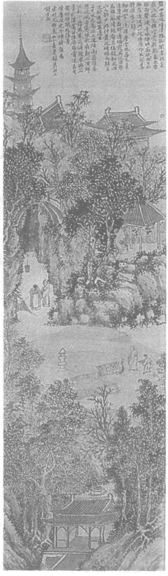 | 释义 | 钱榖虎丘前山图轴明。钱榖(见《钱榖晴雪长松图轴》条目)绘。纸本设色。纵111.5厘米,横31.8厘米。北京故宫博物院藏。此图绘苏州虎丘山前景物胜迹。虎丘塔、云岩寺掩映于葱郁茂密的树木之中,为图中远景。剑池、双钓桶、千人石旁,有游人观赏、游览,为图中中景。近景山门两旁的高坡上,树木成荫,枝繁叶茂,树干笔直劲挺。构图平稳严密,笔墨娴熟,工整秀雅。上部自题七律三首:“碧山高处结清游,孤阁虚明景最幽。秋色横空彩霞乱,岚光含瞑雨声稠。青林掩映高低树,白水微茫远近洲。一段胜情吟不就,暮钟催客上归舟。细雨霏霏浥暝尘,空林落木景凄清。登高聊适烟霞兴,把酒都忘离乱情。绝壑泉枯销剑气,四山人静少游行。萧然禅榻忘归去,况对汤休竺道生。上邑风光属近丘,追陪高盖结春游。暖风淡荡摇歌扇,新水澄鲜泛彩舟。舞燕蹙花停复举,游丝罥树堕还留。佳辰胜赏怀良友,独抚雕阑抱隐忧。隆庆改元仲冬,钱穀为东州光作虎丘小景并录旧游之诗于上。”钤〈叔宝〉、〈句吴逸民〉二印。此图是钱榖60岁时所作,画法未离师门。