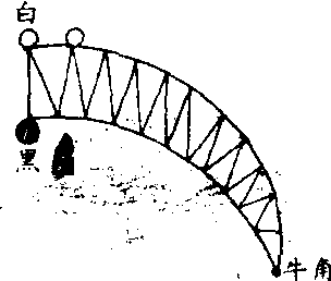 民间娱乐方式,流行于鲁西南。劳作之余,就地画上图案即可游戏。如图,其斜线无定数,都成小三角形为止,一般两人进行,一人一子,一人两子。玩法:不论正斜上下,按路线一次走一步,走时彼此设法使对方钻入牛角,走至牛角处不能再行者为输,输赢带有一定的偶然性。