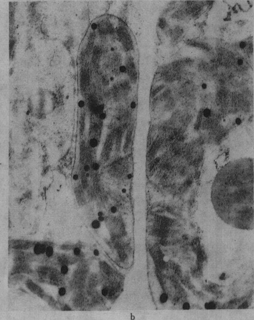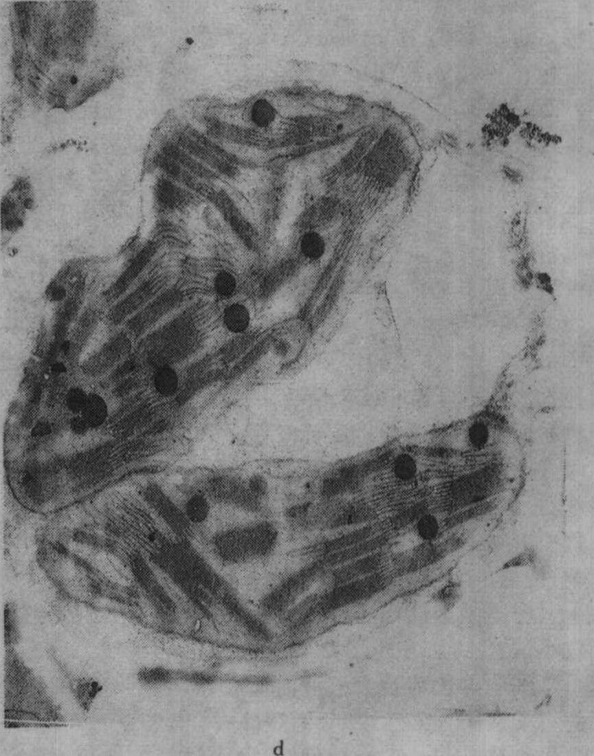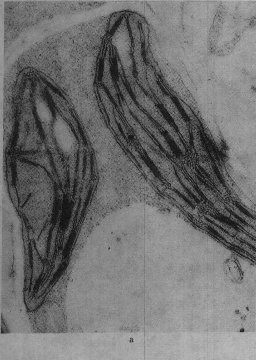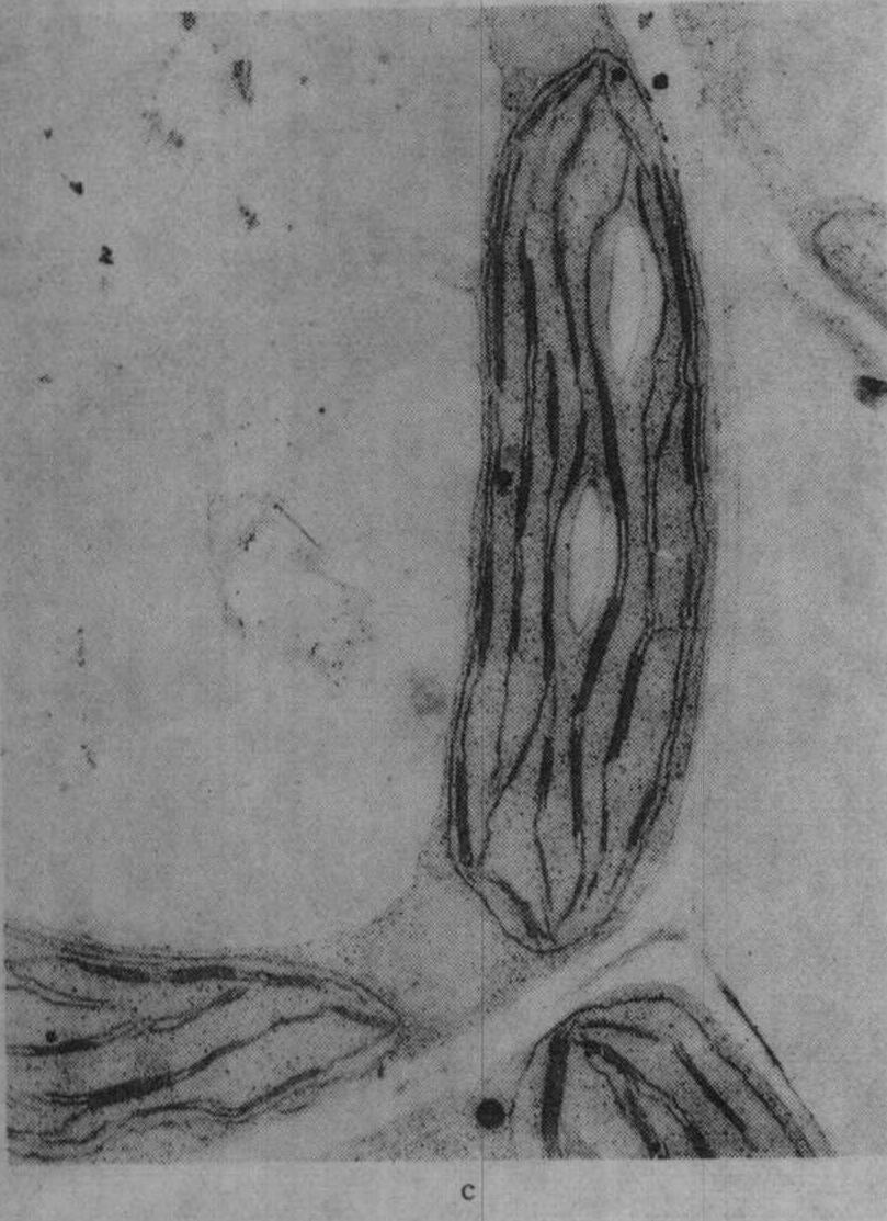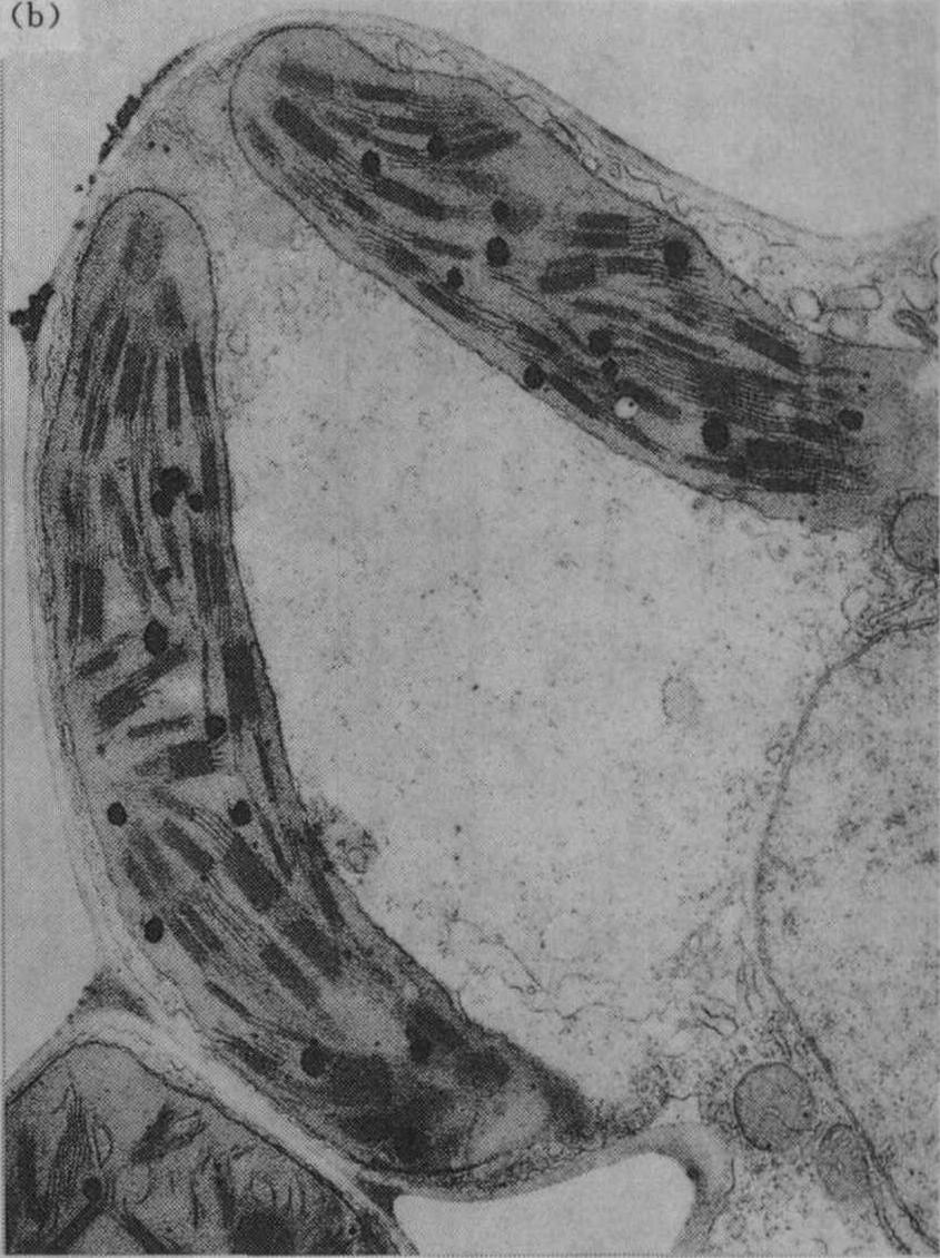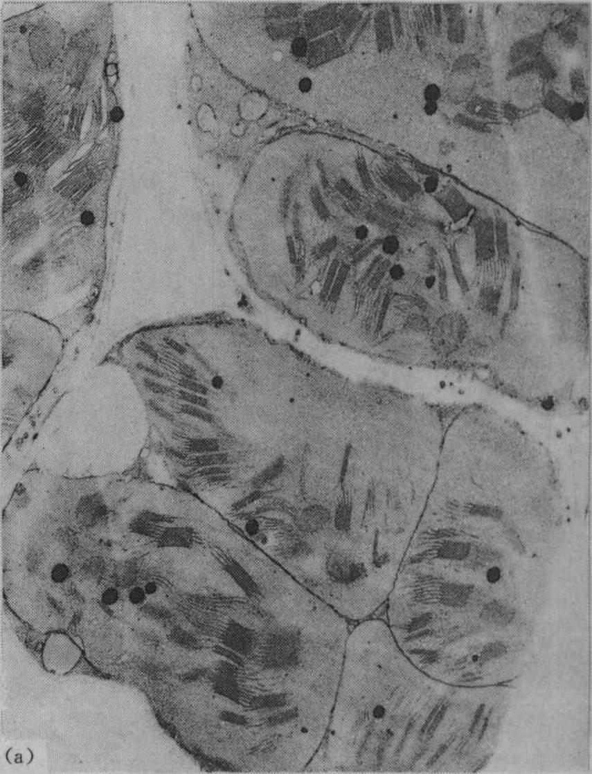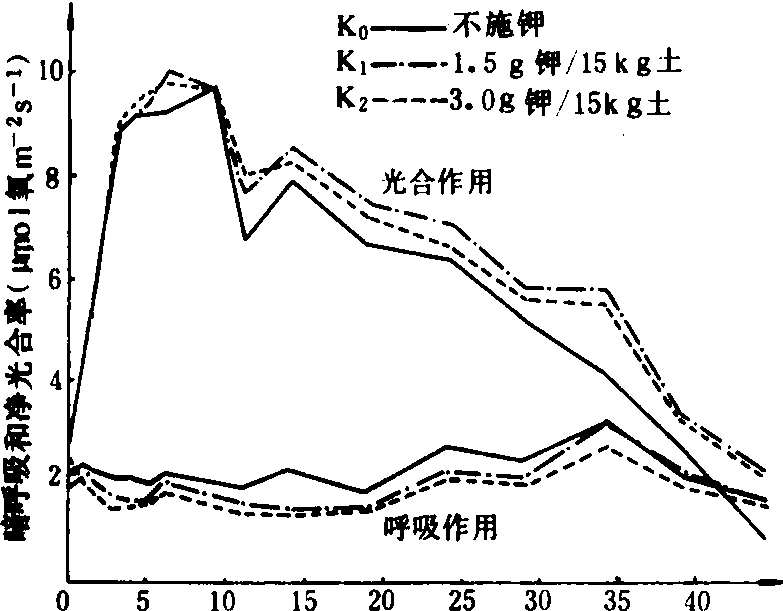 注:PEP为磷酸烯醇丙酮酸;ATP为腺苷三磷酸;ADP为腺苷二磷酸;AMP为腺苷一磷酸;Pi为无机磷酸;PPi为焦磷酸;CoA为辅酶A;UTP为尿苷三磷酸;UDP为尿苷二磷酸;RuBP为1,5-双磷酸核酮糖 从表1可见,K+通过活化酶的作用,多方面参与植物代谢过程。 光合作用 叶绿体是光合作用的重要细胞器,适量施钾的植物叶绿体内有较多基粒;缺钾时叶绿体的基粒较少,使光合作用受到影响;图1为盆栽杂交稻威优35号,在分蘖期不施钾及适量施钾处理的叶绿体超微结构的电镜照片(放大12000倍)。从图中可见钾缺乏使叶绿体失去正常结构,其形状较短而圆,基粒明显较少;适当施钾处理的叶绿体呈扁圆形,基粒较多。观察番茄不同钾水平处理叶的叶绿体情况亦相似。 缺钾还使叶绿体发育迟缓而解体较早,图2示水稻缺钾处理(盆栽,不施钾)及适量施钾处理的叶绿体发育情况,从图2中可见,出叶后第2天缺钾叶的质体中尚有原片层体,而适量施钾的质体内则原片层体已发育成片层体。出叶25天后,缺钾叶绿体已开始解体,片层结构趋于模糊,当时叶片的净光合率明显下降,而施钾处理的叶绿体仍具有较完整的超微结构,叶片的净光合率明显高于不施钾处理。不同钾水平处理植株叶片发育过程中,其叶绿体的发育情况与叶片净光合率的动态变化进程相吻合,如图3所示。缺钾使叶片发育过程中净光合率降低而暗呼吸速率增高,故光合产物形成量减少而消耗量增多,易引起早衰。 施钾对植物光合作用的各个环节都有促进作用,包括希尔反应(Hill reaction)。光合电子传递、光合磷酸化作用、CO2的固定和同化以及光合产物的运输各方面。缺钾时,这些环节都受到抑制,所以净光合率明显降低;光合作用是产量形成的基础,因而影响产量。 渗透调节 K+是细胞液中主要的阳离子,约占总渗透浓度的40%,甚至更高,说明K+在渗透调节中的重要性。细胞伸长与其含钾量有密切的联系,K+同有机酸阴离子是细胞伸长中液泡内积累的主要溶质,例如,棉花纤维生长时,在细胞内积累K+及苹果酸阴离子,二者作为主要的溶质,使细胞膨压增高,促进纤维伸长生长。当棉纤维生长最快时,也是纤维内K+与苹果酸阴离子积累量达高峰时,到棉纤维生长速度下降时,K+及苹果酸阴离子含量以及膨压也都降低。棉胚珠在黑暗中固定HCO-3,主要产生苹果酸;当缺钾或大气中CO2不足时,细胞膨压降低,棉纤维生长受到影响,使棉纤维变短。 由于缺钾时细胞膨压减低,故生长受阻而使细胞较小,植物叶面积也因此减小。 细胞伸长涉及大液泡的形成,这需要增加细胞壁的可塑性同延伸性,吲哚乙酸(IAA)具备这种功能,它促进细胞伸长。但在缺钾时,IAA诱导的伸长即降低甚至停止,因为IAA诱导的细胞伸长是与H+排出相联系的。用胚芽鞘试验的结果表明,H+排出与K+内流保持电化学平衡的关系,缺K+时就影响H+排出,因而导致IAA诱导的伸长受到抑制。赤霉酸(GA)诱导的茎伸长亦需要K+,缺钾时也受抑制。伸长生长对缺钾最敏感,往往在光合作用受抑制之前,伸长生长即受到抑制。
