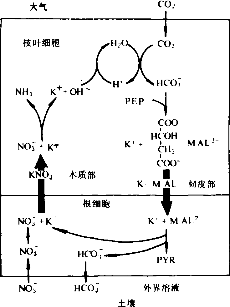 气孔开闭是保卫细胞及周围细胞间膨压平衡变化的结果。保卫细胞内K+浓度增高,水势降低,从相邻细胞吸水,使其膨压增高,气孔张开;气孔关闭的情况则反之。在气孔运动中,K+的渗透调节功能不能用其他阳离子代替。脱落酸(ABA)抑制气孔张开或诱导气孔迅速关闭,主要是由于ABA引起K+从保卫细胞外流量增加。光通过结合在保卫细胞质膜内的H+泵ATP酶的作用,诱导K+在保卫细胞内积累,因为ATP酶使ATP水解,从保卫细胞内泵出H+,与此同时,保卫细胞外的K+即进入,所需ATP由保卫细胞内叶绿体的光合磷酸化作用提供。 植物的感夜运动及感震运动也是膨压调节的运动,K+同样有关键性的作用。如合欢树,其羽状复叶在白天张开,夜间闭合,叶片的开闭是由于叶柄基部的叶枕膨压变化所引起。叶枕内的H+泵ATP酶在光下泵出H+,使K+进入,导致水分进入而引起膨压增高,叶片张开;黑暗中则由于K+外流引起其膨压降低而使叶片关闭。含羞草叶的感震运动也是由于叶枕膨压变化所引起,受到刺激时叶枕内的K+再分配,导致含水量及膨压改变,膨压降低时,叶闭合;膨压增高时,叶张开。 阴阳离子平衡及pH调节 K+无论在平衡细胞结构内大分子的阴离子电荷或是在液泡、木质部及韧皮部内可转移的阴离子电荷中都是最主要的阳离子,K+在细胞质及叶绿体内保持较其他部位为高的浓度,这是平衡无机及有机阴离子电荷所必需,同时也可保持这些部位的pH值在7~8,这是大部分酶促反应的最适pH值,使其中的酶类能保持较高的活性。例如,硝酸还原酶当pH值从7.7降至6.5时,其活性几乎完全被抑制。 细胞的质膜及液泡膜结合的H+—ATP酶泵出H+,同时K+即进入,保持细胞质一定的pH值,虽然其他几种一价阳离子在一定范围内可取代K+,例如NH+4,但它在高浓度下对细胞有毒害作用;Rb+的一些性质和K+相似,但自然界很少;Na+不能代替K+对酶的活化作用。 钾促进植物根对NO-3的吸收,并促进NO-3在植物体内的运输,K+是NO-3和苹果酸阴离子在植物体内运输过程中的反离子(counter ion),如图4所示。根吸收的NO-3从根运往地上部的过程中,K+可平衡其电荷;另一方面,地上部磷酸烯醇丙酮酸固定CO2形成草酰乙酸,后者还原形成苹果酸。苹果酸阴离子经韧皮部运往根系的过程中,K+也有平衡电荷的作用。在根内苹果酸脱羧产生的HCO-3释放到土壤溶液中时,NO-3则吸入根内,根内的K+又可在NO3 经木质部运入地上部过程中平衡其电荷,可见K+可促进NO-3的吸收和运转。