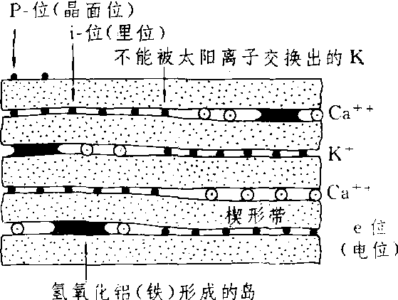膨胀型层状硅酸盐矿物与层间离子,楔形带及P,i和e位的模型(Rich,1968) |