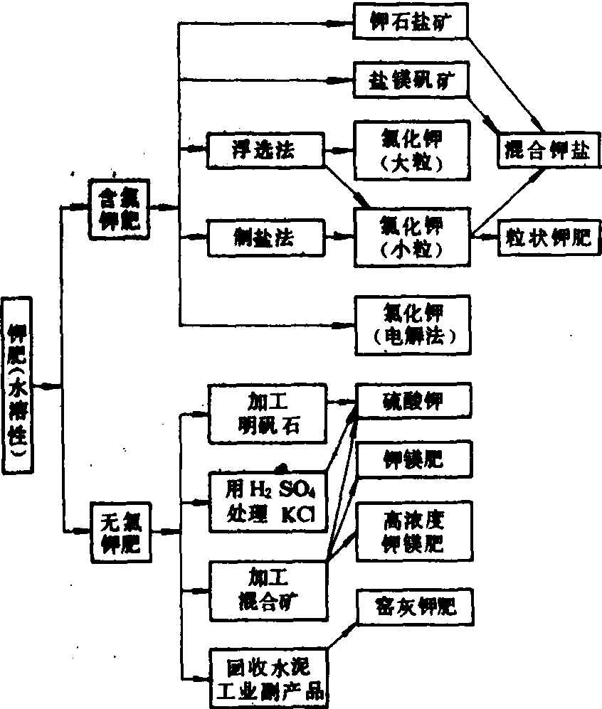 生产钾肥的主要原料有钾石盐NaCl·KCl、无水钾镁矾K2SO4·2MgSO4、光卤石MgCl2·KCl·6H2O等。将钾石盐通过浮选法、溶解结晶法或重液分离法可制得氯化钾晶体。若先用淡水分解光卤石,然后用溶解结晶法也可得到氯化钾。用无水钾镁矾与氯化钾进行复分解反应