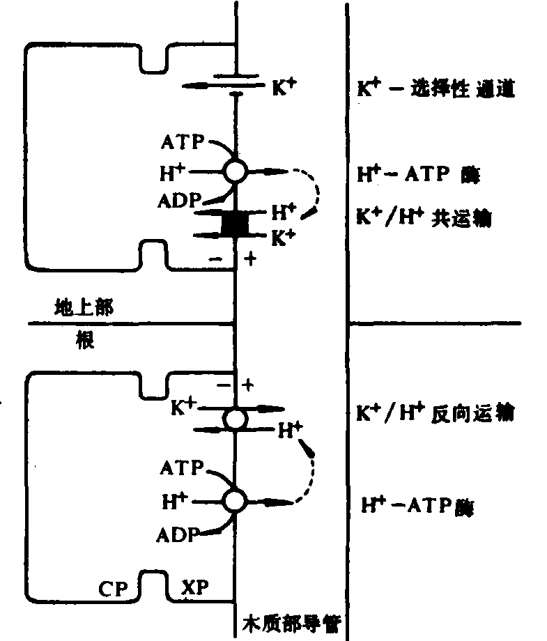 K+在木质部导管内运输途径中,可以转移到周围木质薄壁细胞,同时木质薄壁细胞内的K+也可运到导管中。木质部运输和韧皮部运输之间也可交流。 韧皮部运输 K+是韧皮部筛管液中含量最高的阳离子。筛管液中高浓度的K+随糖分运输流大量的流动。筛管细胞质膜中亦有H+-ATP酶,它从筛管细胞泵出H+,启动H+—蔗糖共运输;在H+外流的同时,K+被吸收到筛管。通常通过韧皮部运到需要大量碳水化合物的正在生长的地上部分、根或贮藏器官的主要成分是蔗糖,但也有高浓度的K+,K+的功能可能有以下几方面:❶促进韧皮部运输。K+对韧皮部运输的促进作用主要是由于其在合成代谢中的功能。K+促进蔗糖合成,蔗糖是碳水化合物运输的主要形式;K+也促进淀粉及蛋白质合成,故促进从源运到库的糖分及氨基酸的利用,因而促进同化物从源到库的运输。此外,K+沿着韧皮部运输途径调节膨压,也促进溶质在筛管中运输; ❷阴阳离子电荷平衡和促进根对NO-3的吸收。根吸收的NO-3从根通过木质部导管运往地上部枝叶以及枝叶中形成的苹果酸阴离子通过韧皮部运到根的过程中,K+都作为这些阴离子的反离子(coun-terion),平衡其电荷;苹果酸在根内氧化脱羧形成的HCO-3释放到土壤溶液中,又与NO-3交换,使根吸收NO-3; ❸在有效钾的供应不足或在植物发育后期时,钾的再利用对维持营养生长或供应生殖生长所需的钾有重要作用。 |