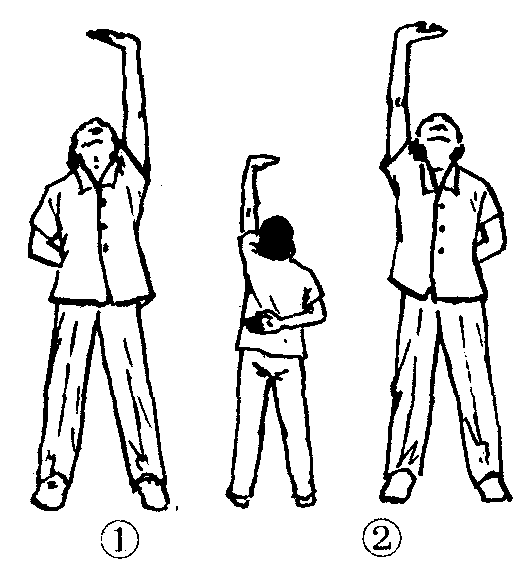 练功十八法第1套第6节。动作过程:两脚分立,略宽于肩。❶左臂经体侧上举成托掌,眼始终看左手背,同时右臂屈肘,手背紧贴左腰后部。(图2—4—126—❶)❷左臂仍经体侧下落还原成预备姿势。❸❹动作与❶❷相同,换右臂做。(图2—4—126—❷)共做4个8拍。注意事项:上举时上体要保持正直,手臂伸直,眼随手动。此功法对肩关节僵直,颈肩、腰痛及胃脘胀满都有一定疗效。