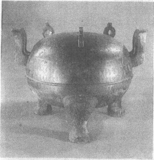 铁足铜鼎出土于广西平乐银山岭战国墓葬中,共3件。两件圆腹,圜底,子口,附耳,耳孔为三角形,短柱状足,鼎身铜铸,鼎足心为铜质,外面包铸铁足。另一件,鼎身铜质已朽,有三铁足马蹄形,内侧平,下端外撇。铁足铜鼎的发现表明,战国时期壮族先民已掌握较成熟的焊接技术。 |