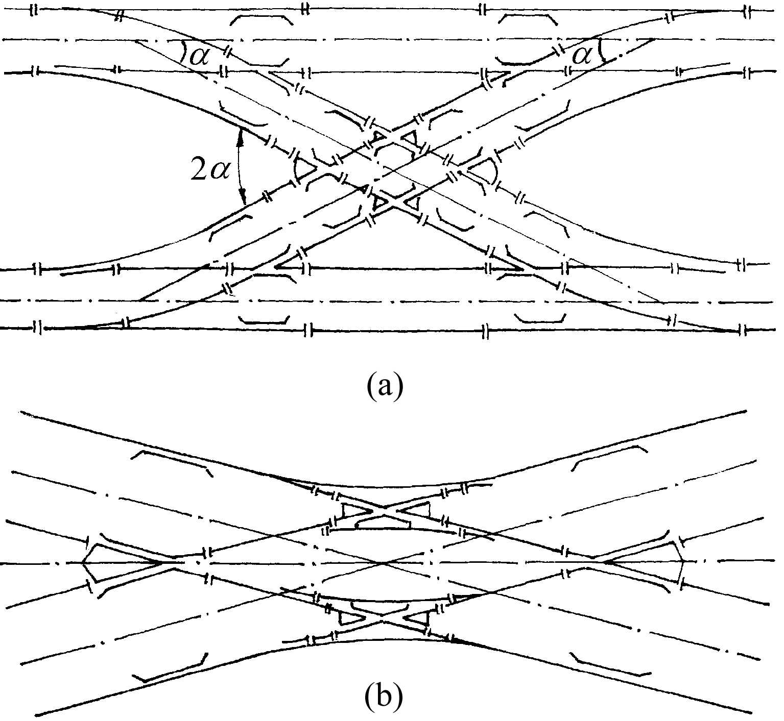 | 释义 | 铁路交叉railroad crossing铁路上一股轨道与另一股轨道的平面交叉。分直角交叉与菱形交叉两种。两股轨道相互成直角者为直角交叉,成某种角度者为菱形交叉。菱形交叉可与道岔组合构成交叉渡线(图a),使两股平行轨道间形成通路;还可以与转辙器组合成交分道岔(图b),它不但能使两条相交的轨道形成通路,而且还可使列车从一股轨道转向另一股轨道。