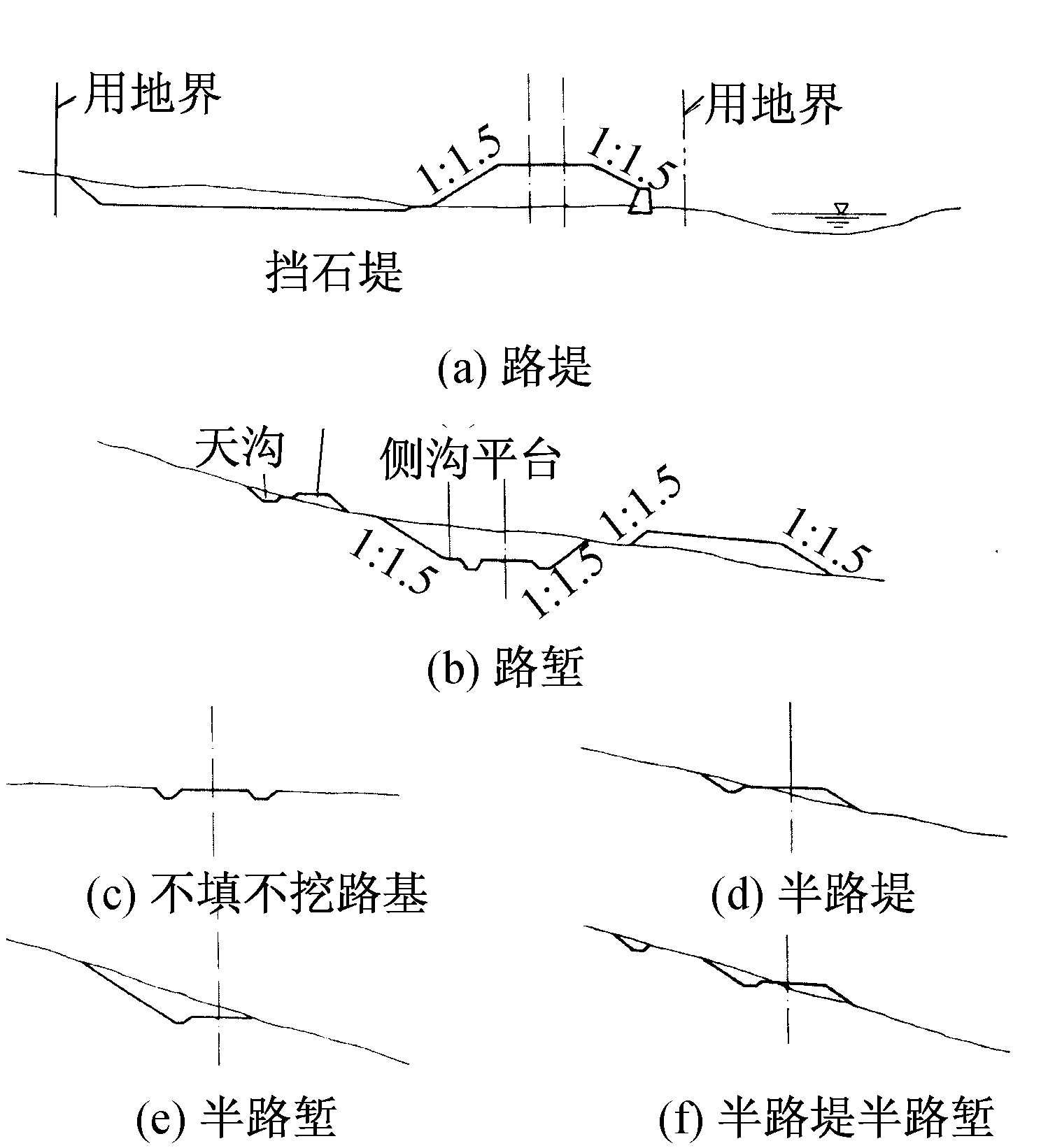| 释义 | 铁路路基railway subgrade铁路轨道的基础。铁路线路的重要组成部分。与桥梁、隧道相连,共同组成一个线路整体。由路基本体、路基防护和加固建筑物以及路基排水设备三部分组成,路基本体是直接铺设轨道结构并承受列车荷载的主体建筑物,其余均属附属建筑物。按线路设计的路肩标高与地面标高的关系,有的要填筑成路堤(图a),有的则要开挖成路堑(图b),此外,还有半路堤(图d),半路堑(图e),半堤半堑(图f)和不填不挖(图c)等形式。其中路堤和路堑是最主要的两种形式。