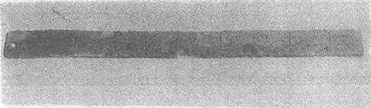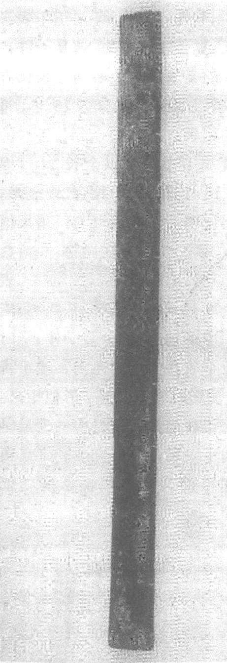 铜尺西汉。残长4.7厘米,宽2.4厘米,厚1.5厘米。1970年山东省曲阜九龙山西汉鲁孝王刘庆忌墓出土。山东省博物馆藏。此尺用铜制成,残存二寸,通体有剥蚀。正面第一寸阴刻十分,第二寸未刻分。一侧面阴刻一人执剑挥舞纹饰,另一侧是一人手扬长带跳舞的怪人纹饰,背面无刻纹。以残长二寸为4.7厘米推算,则一尺长应为23.5厘米。