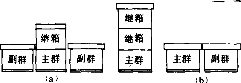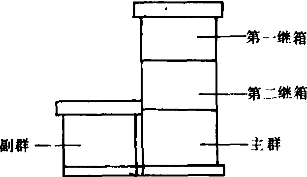 ❷以采蜜为主的主副群管理。将两三个蜂群排列在一起,其主副群互相调整的方法与❶基本相同,使主副群的群势在流蜜前都繁殖到符合采蜜群的要求。如果在大流蜜期前主群仍达不到采蜜群要求,可以在流蜜刚到来时将副群移走,重新组成主副群;将主群保留在原地,加上继箱,以集中原主副群的飞翔蜂,实现强群采蜜(图1)。采用十六框卧式蜂箱的蜂场,其主副群的管理,是用闸板将箱体分为两区,10框区为主群,6框区为副群,各开巢门;当主群发展到满箱时给主群加第1继箱,其管理办法与一般继箱群的管理办法相似。当第1继箱充满蜜蜂,并面临主要蜜源流蜜时,在巢箱和继箱之间加第2继箱供蜂群贮蜜。(图2)