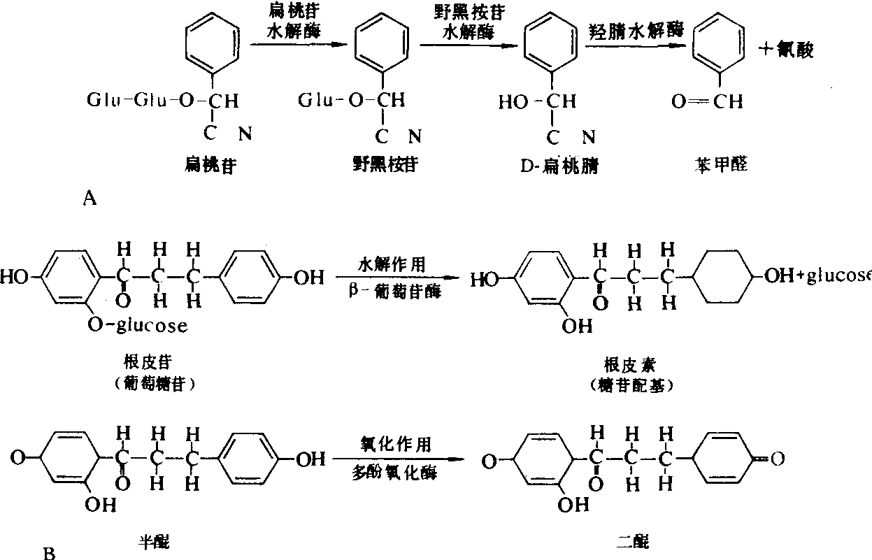 A.含氰酸的糖苷水解后游离出氰酸 B. 根皮苷经水解和氧化生成抗菌物质二醌的过程