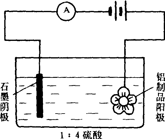 | 释义 | 铝制品的氧化与染色luzhipin de yanghua yuranse铝是银白色而具有光泽的金属,然而市售的铝制品却往往有着红、黄、蓝、金等各种美丽的色泽,这不仅使制品外表美观,更可以起到有效保护与耐磨的作用。铝是一种活泼金属,接触空气后立即生成一层致密的天然氧化膜,它既光滑又紧密,无机颜料及有机染料却难以附着。因此制作中首先要通过阳极氧化的方法在制品表面形成一层比天然氧化膜既厚且疏松的氧化膜,该氧化膜能吸附染料,进行染色。实验步骤: ❶ 阳极氧化 将需染色的铝制品用10%的热(50℃)碱液化学去污0.5~1min,取出后用蒸馏水反复冲洗再上槽氧化。电解槽的连接方式见下图 (从清洗去油污到上槽不能将铝制品暴露在空气中)。电解条件: 电压12V,电流1.5A,电解液为1:4稀硫酸 (每200mL加草酸1g),电解时间约30min,温度保持在20℃ (可将电解槽放在冷水中降温)。
