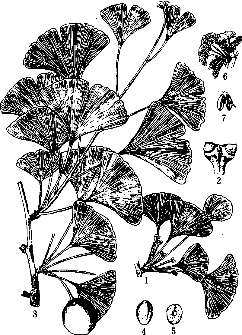 银杏纲Ginkgopsida裸子植物门中古老原始的一纲。落叶乔木。木质部具管胞,无导管。单叶,扇形,幼苗叶常2深裂,具长柄,有掌状叉分细脉。雌雄异株,球花单性,生于短枝顶端鳞片状叶的腋内;小孢子叶(雄蕊)螺旋排列,形成柔荑花序状的雄球花(小孢子叶球)。每一小孢子叶有两个小孢子囊,囊内产生小孢子,小孢子以后发育成含4细胞的花粉,其中再产生两个多鞭毛的游动精子。雌球花具长梗,梗端常分二叉,叉端具珠座,每珠座生一枚直立胚珠。种子核果状,具3层种皮,胚乳丰富。本纲现存银杏目(Ginkgoales),仅1科,1属,1种。发生于古生代二叠纪,至中生代颇为繁茂,当时有15属以上,分布几乎遍及全球。由中生代晚白垩纪到新生代第三纪,银杏类植物迅速衰落,经过第四纪冰川摧残,仅银杏一种幸存于中国,有活化石植物之称。 |