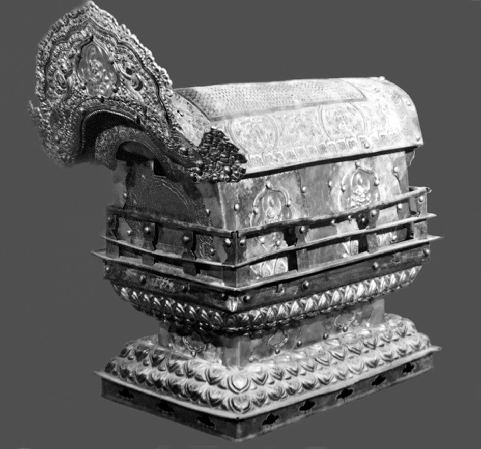 | 释义 | 银椁yinɡuo宋代舍利葬具。1987年5月武功县报本寺塔地宫出土。银椁是金棺的外套,长27.2厘米;大头高28.3厘米,宽20.6厘米;小头高20.3厘米,宽12.2厘米。呈前高后低状,盖镂饰贯线纹,帮镶饰金佛像。座高13.2厘米。连同装置金棺、银椁的银函共重1005克。金棺、银椁造形、纹饰精美,以模压、錾刻、榫铆、折叠、镶嵌等多种工艺制成。现藏武功县文物管理委员会。