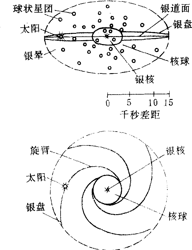 银河系里大多数恒星集中在一个扁球状的空间范围内,呈透镜状。银河系物质密集部分从侧面看像一个薄的铁饼称银盘。银盘直径约为25千秒差距(1秒差距等于3.08×1013千米),银盘中心厚,边缘薄,其中心厚度约2千秒差距,在太阳处厚度约为1千秒差距,银盘的中央平面叫银道面。在银盘中心隆起的近球形部分叫核球。长轴为4~5千秒差距,厚约4千秒差距。在核球中心有一个致密区为银核。在银盘四周笼罩着一个直径约为30千秒差距的近似球状分布的稀薄的银晕,银晕中最亮的成员是球状星团。再往外是一个巨大的大致呈球形、物质更为稀薄的银冕。银盘有旋臂结构,在太阳附近有三条旋臂:人马臂、猎户臂、英仙臂。在银心方向还有一条3千秒差距臂。太阳位于银道面以北约8秒差距、距银心10千秒差距处的猎户臂内侧,正以250千米/秒的速度绕银河系中心运行,公转一转需要2.5亿年。银河系是一个巨大的天体集团,它拥有一二千亿颗恒星和大量由气体和尘埃构成的星际物质。恒星常以成双、成群、成团和成协的形式出现,组成了双星、聚星、星协和星团。而气体和尘埃则有相当一部分以银河星云的形式出现,其余的弥散于星际空间。银河系的总质量为1.4×1011太阳质量,其中恒星占90%,气体和尘埃组成的星际物质占10%,而高达总质量85%~90%的恒星及星际物质集中在银盘内。银河系内的恒星可分成星族Ⅰ和星族Ⅱ两个不同类型。星族Ⅰ是年轻而富金属的天体,星族Ⅱ是年老而贫金属的天体。银盘内大多数恒星属于星族Ⅰ的年轻星,而银盘四周银晕中的恒星主要为星族Ⅱ年龄较老的恒星。 银河系Yinhexi地球和太阳所在的恒星系统、是一个具有旋涡结构的巨大星系。它在天球上的投影是乳白色亮带叫银河,银河系因银河而得名。银河系包含各种类型的恒星总数在二亿颗以上。银河系的中心区域恒星密集,距中心越远恒星分布越稀疏。银河系的主体称为银盘,中心厚度约为一万光年,边缘厚约一千光年,直径约为八万光年。银河星团、星云组成旋涡结构迭加在银盘上。银盘中部是一个很小的致密核心,称为银核,其长轴约13 000到16 000光年,厚约13 000光年,这里是恒星分布最密集的部分,估计质量约为7×109太阳质量。银核的中心称银心,是恒星极致密的区域,这里恒星密集的程度比太阳附近要大千万倍。银核四周也聚集着大量恒星。在银盘周围,呈球状分布的广大区域叫银晕,银晕的物质密度比银盘要低得多,主要是稀疏分布的老年恒星和星际物质。其直径约16—17万光年。在银晕外围,近于球状的巨大射电辐射区叫银冕。银河系的主要范围在10万光年左右,总质量约1.4×1011太阳质量。太阳只是银河系中众恒星中的普通一员。银河系中恒星约占90%,气体和尘埃组成的星际物质约占10%。银河系中的物质呈旋涡状结构分布,因此从俯视图上看,银河系是个旋涡星系,由核体伸出四条螺旋状的旋臂叫银河系旋臂,恒星绕银河系中心旋转,由于恒星绕银河中心旋转时,速度和密度都发生变化,密度极太的波峰呈旋涡状分布形成旋臂。恒星在银河系中的位置不同,旋转的速度也不同,在太阳附近银河系的旋转速度是250公里/秒,大约2亿5千万年绕银心转一周,离银河系中心远的地方恒星旋转的速度慢。一般在银盘内绕银河系中心转动的星体比较年轻,在银晕和核球中围绕银河系中心转动的恒星比较年老或是星际物质。银河系内所有恒星都在绕银河中心转动,银河系整体也在作自转运动。