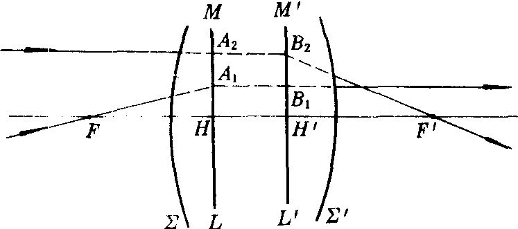| 释义 | 主平面zhupingmian理想光学系统的一对基面。主平面是横向放大率β=+1的一对垂轴共轭面,又称主面。图中示出了作图求主平面位置的方法。Σ和Σ′分别表示系统最前和最后的折射面。作通过系统前焦点F的入射光线及其出射光线(该出射光线必与光轴平行),过这二光线的交点A1作垂直于光轴的平面ML,此平面叫做系统的前主平面,又称物方主平面或第一主平面。作平行于光轴的一条入射光线及其出射光线(该出射光线必通过系统的后焦点F′),过这二光线的交点B2作垂直于光轴的平面M′L′,此平面叫做系统的后主平面,又称像方主平面或第二主平面。通过前主平面上一点的入射光线,一定从后主平面距光轴等高处出射。例如A1和B1距光轴等高,A2和B2距光轴等高。二主平面与光轴的交点H和H′是一对主点,它们分别叫做前主点(又称物方主点或第一主点)和后主点(又称像方主点或第二主点)。单球面折射系统和球面反射镜的二主平面重合,二主点重合于球面顶点;薄透镜的二主平面亦重合,二主点重合于薄透镜的中心。