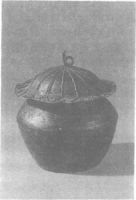 元。通高8厘米,口径5厘米。1960年4月江苏省无锡市南郊钱裕墓出土。江苏省无锡市博物馆藏。此罐有盖,盖呈荷叶形。罐为直口,折肩,斜腹下收,平底。底部原铸有铭文,已模糊不可辨读。该器造型新颖别致。
