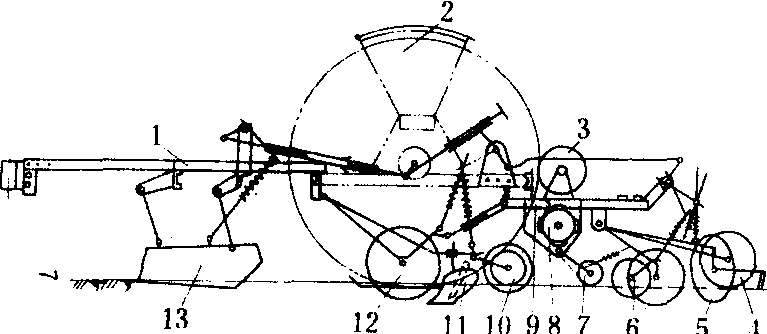 图1 缝隙式铺膜播种机 1.牵引架;2.种肥箱;3.膜辊;4.盖土轮;5.覆土圆盘;6.压膜覆土轮组;7.展膜辊;8.划缝器;9.后机架;10.镇压轮;11.开沟施肥小铧;12.开沟器;13. 平土器 作业时,前方的平土器平整种床,刮去表层干土;排种器排出的种子经开沟器播到种沟内;两边带有输肥管的小铧开出铺膜沟,排肥器排出的肥料亦同时施入沟底;由覆土圆盘回土覆盖并经镇压轮镇压,完成播种施肥作业。塑料薄膜则经划缝器、展膜辊、压膜覆土轮铺到种床上,并将地膜两边埋好压紧,覆土轮在膜的缝隙上和在膜边缘上覆土。位于后部的刮土板,将两膜间的地刮平,以达到保墒,从而一次完成平地刮土、开沟、播种、施肥、铺膜、镇压等作业。