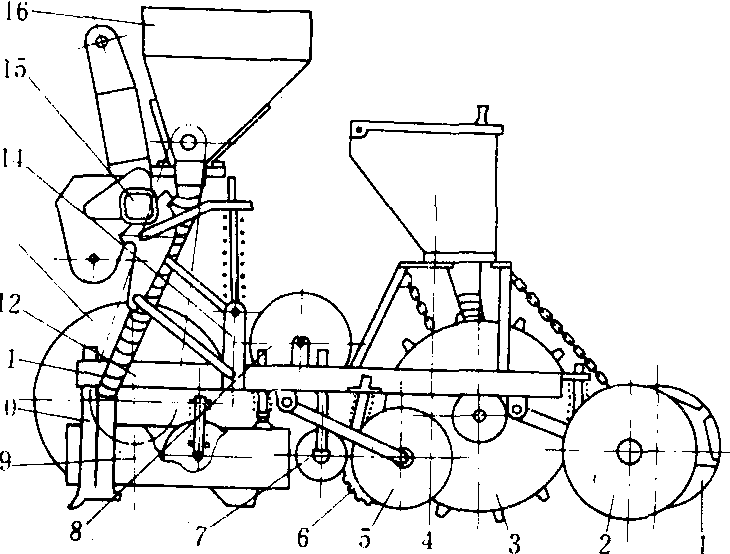 图2 鸭嘴式铺膜播种机 1.覆土推送器;2.后覆土圆盘;3.点播器;4.种子箱;5.前覆土圆盘;6.压膜辊;7.展膜辊;8.膜辊;9.平土器及镇压辊;10.开沟器;11.输肥管;12.传动链;13.地轮;14.副梁及四连杆机构;15机架; 16.肥料箱 鸭嘴式铺膜播种机 其结构如图2。每个播种单组配置两行开沟、播种、施肥等工作部件,并设一卷塑料薄膜和相应的展膜、压膜装置。作业时,肥料箱内化肥由排肥轮送入输肥管,经施肥开沟器施在种行的一侧,平土器将地表干土及土块推出种床外,并填平肥料沟,同时开出两条压膜小沟,由镇压辊将种床压平。塑料薄膜经展膜辊铺至种床上,由压膜轮将其横向拉紧,并使膜边压入两侧的小沟内,由覆土圆盘在膜边盖土。种子箱内种子经输种管进入穴播滚筒的种子分配箱,随穴播滚筒一起转动的取种圆盘通过种子分配箱时,从侧面接受种子进入取种盘的倾斜型孔,并经挡盘卸种后进入种道,随穴播滚筒转动而落入鸭嘴端部。当鸭嘴穿膜打孔达下死点时,凸轮打开活动鸭嘴,使种子落入穴中,鸭嘴出土后,由弹簧使活动鸭嘴关闭。此时,后覆土圆盘翻起的碎土,小部分经锥形滤网进入覆土推送器,横向推进至穴行覆盖在穴孔上,其余大部分碎土压在膜边上。 铺膜播种机plastic film covererseeder在地面铺放塑料薄膜并在膜上打洞穴播种子的机具。主要由施肥、整形、铺膜、打洞穴播和覆土等几部分组成。工作时,肥料经输肥管施入滑刀式开沟器开出的种沟中,平土框及镇压辊对种床镇压整形,圆盘开沟器开出埋膜小沟,地膜由展膜辊平铺地面,滚管穴播器在膜上滚动打孔,同时将种子播入穴中,覆土圆盘和覆土花篮将膜边埋紧并将膜孔带覆土。 |