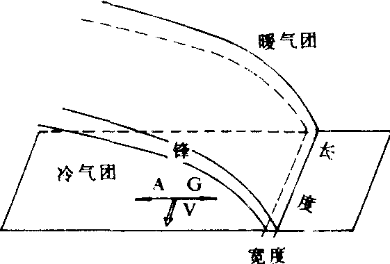 | 释义 | 锋feng冷暖两种气团间的交界面,又称锋面。锋面两侧的温度、湿度、气压、风和云等气象要素有明显差异,因而锋面也可以看成是大气中气象要素的不连续面。锋面在空间是倾斜的,倾向冷气团的一侧,坡度在1/100~1/300左右,这是地转偏向力作用的结果。为了说明这个问题,曾作过一个简单实验:在一个中间有隔板的容器中,一侧注入油,一侧注入水,然后抽去隔板并让容器绕铅直轴旋转,便会看到油流向水之上,油水之间的分界面逐渐呈倾斜状态。大气中的锋面与实验类似。当冷、暖气团相遇时,冷气团密度大于暖气团(类似于水重于油),必然有一个由冷气团指向暖气团的气压梯度力 (Gn) 存在,它使冷气团向暖气团一侧移动,并迫使暖气团爬越其上,力促两者间的分界面趋于水平。然而在自转的地球上,空气一旦运动,立即便有地转偏向力 (A) 产生。当水平地转偏向力与锋面气压梯度力达到平衡时(见图),冷空气便平行于锋线运动,不再推挤暖空气了,这样锋面便保持住倾斜状态而不会变成水平。