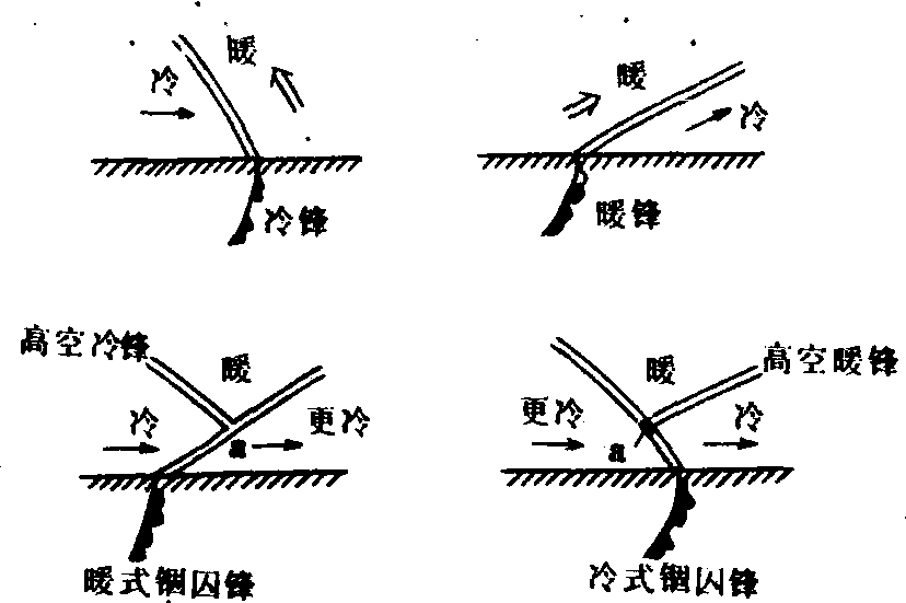 各种类型锋面垂直剖面图 锋与空间某一水平面或垂直面相交的区域称为锋区。锋区两侧,温度、湿度、风向、风速、气压梯度、气压变量、垂直速度、云系和降水等气候要素都表现出明显差异。如温度,锋区内水平梯度每100公里约为10℃,而气团内部每100公里约为1℃。 锋面之所以倾斜是地转作用造成的。地转偏向力愈大,锋面愈倾斜。而地转偏向力随纬度是有变化的,纬度愈低,地转偏向力愈小。因此,一条锋面从高纬移向低纬时,其坡度将逐渐变小,到达赤道地区时,水平地转偏向力为零,暖空气便完全位于冷空气之上,两者界面成为水平,锋就不存在了。锋面的宽度在近地面层,大约数十公里;在高层可达300—400公里,甚至更宽。锋的长度从数百公里到数千公里。锋在空间伸展的高度,有的只限于对流层低层,甚至1.5公里以下,称近地面锋;有的达到对流层中、上层,称对流层锋。 锋的分类法很多,有一种类似于气团的地理分类法,将锋分为冰洋锋、极锋、副热带锋等;另一种是根据锋面两侧冷暖气团的移动方向,把锋分为冷锋、暖锋、准静止锋和锢囚锋等。这种分类在实际工作中应用广泛(如图所示)。 冷气团向暖气团区移动所形成的锋,叫做冷锋。当冷锋过境时,风速加大,云层增厚,常出现连续性降水。当冷气团移动速度很快时,锋面上出现强烈阵雨、雷雨、大风等天气,一般风雨的持续时间较短。冷锋过境后,气温常有下降,气压上升,降水停止。 暖气团向冷气团区移动所形成的锋,叫做暖锋。当暖锋过境时,云层加厚,常伴有大范围的连续性降水。暖锋过境后,气温升高,气压降低,雨过天晴。 移动缓慢的锋(或冷、暖气团势力相当),即冷、暖气团之间的界面呈准静止状态的锋叫做准静止锋。它常造成持续时间较长的宽广的云雨区。 气旋区冷锋移速快于暖锋,并追上暖锋;或因地形作用,两冷锋迎面相遇而合并形成的锋,叫做锢囚锋,它保留了原来两条锋面天气的特点。 锋面的生成、加强称锋生;减弱、消失称锋消。影响锋生、锋消的因素有:水平气流的辐合、辐散;空气的升降运动以及气团的增温、冷却等。 在北(南)半球,锋面两侧的气流,呈逆(顺)时针旋转,两侧的地面风朝锋线附近辐合,近地面水平气流为辐合上升。我国大部分地区处于温带,冷、暖气团活动频繁,锋生现象十分明显。主要锋生地带有两个:一是在东北、内蒙古一线,并与北支锋区(极锋锋区) 相对应;另一是在长江以南地区,与南支锋区(副热带锋区)相对应。 锋Feng冷暖属性不同气团间的交界面。同冷、暖气团相比,锋区温度水平梯度很大,湿度、风、云都有明显差异,是天气非常活跃区域。锋面水平方向延伸的长度在数百公里到数千公里;伸展的高度视冷暖气团的高度有所不同,有的限于低空,有的可达对流层中、上部。锋从生成到消亡的时间可达5—7天,甚至更长。 锋性质不同的两种气团之间的过渡区。因其水平宽度远比气团的范围小,可以近似视为一几何面,称“锋面”。锋面与地面的交线称“锋线”,简称“锋”。锋两侧的温度、湿度等要素差异很大。锋面上常伴有云、雨、大风等天气现象。 锋nonmouldboard plough发掘坚垎土壤的古农具。用于浅耕灭茬和中耕。王祯《农书·农器图谱》:“锋,古农器也。其金比犁镵小而加锐。其柄如耒,首如刃锋,故名锋,取其銛利也。” |