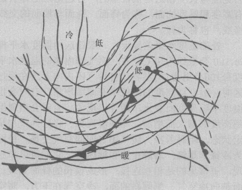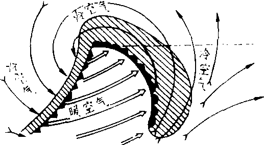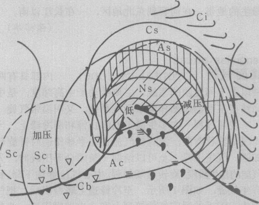 图 2 气旋天气模式 锋面气旋frontal cyclone内部有锋面的气旋。主要活动于中高纬度,更多见于温带,又称“温带气旋”。它是中高纬度主要的风暴和降水天气系统。气旋内部气流辐合上升,锋面上气流上升更为强烈,往往产生云雨,甚至造成暴雨、雷雨、大风天气。发展成熟的锋面气旋的天气模式是:气旋前部是宽广的暖锋云系及相伴随的连续性降水天气;气旋后部是比较狭窄的冷锋云系和阵性降水天气;气旋中部是暖气团天气,如果暖气团中水汽充足而空气又稳定,可出现毛毛雨;如果不稳定,则可出现雷暴、冰雹等强对流天气;如果气团干燥,只能出现一些薄云而无降水。影响中国的锋面气旋,以吉林、黑龙江地区出现的次数最多,常称为“东北气旋”或“东北低压”。其次是长江中下游附近,常称“江淮气旋”。黄河流域、华南地区也可出现锋面气旋,也是重要的降水天气系统。锋面气旋的强度自地面向上逐渐减弱,一般到3~4 km的高度上,大多已变成低压槽。