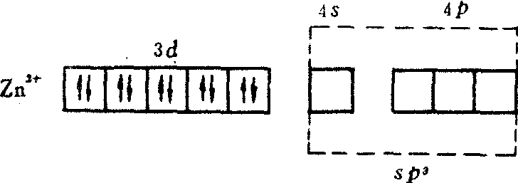 指中心离子锌和配体氨分子形成的配位化合物。如将氢氧化锌溶于氨水可得到无色透明溶液氢氧化四氨合锌配合物。Zn2+电子层构型为[Ar]3d10 (见下图:)