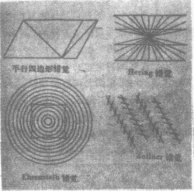 错觉 错觉对客观事物的不正确知觉。由物理、生理和认知等多方面原因引起。常见的有:1.几何图形错觉。如长度相等按丁字形排列的三条线,看起来竖的比横的长。2.空间定位错觉。如飞行中的倒飞错觉。3.在一定心理状态影响下产生的错觉。如“杯弓蛇影”、“草木皆兵”。4.某些精神病患者的错觉。 错觉对客观事物的一种错误感受。正常人在光线暗淡、恐惧紧张心理状态下可产生错觉,但经验证后可纠正认识。在意识障碍时产生病理性错觉,如把地上树影看成种种可怕的形象导致恐惧表现和逃避行为,这种错觉不易纠正。 错觉顾名思义是错误的感觉,即指人们对外界事物不正确的感觉或知觉。最常见的是视觉方面的错觉(图4—32)错觉产生的原因除来自客观刺激本身的特点影响外,还有观察者本身生理和心理方面的因素。生理上的原因与感觉器官的结构与功能有关;心理因素则与生活条件及经验有关。例如,坐进模拟宇宙飞船,开动机器后电视屏幕上可见舷窗外面的大地下降,景物不断缩小并往后退,朵朵云团掠过,天黑后星光闪烁,几分钟看到月球陆地、大山缓慢升起并接触飞船,这时宇航员说月球到达了。实际上飞船并未移动,只将窗外配景下降、后退,使乘客感到上升、前进;月球上升、前进,就好像飞船在下降、后退,最后着陆。这是利用错觉达到模拟效果的典型实例。人们对客观世界的认识可以是无止境的,在此过程中错觉时有发生,如“杯弓蛇影”、“草木皆兵”等成语就是反映与主观情境相关联而产生错觉的实例。由于生理基础产生错觉的现象也不少,如在交叉的食指和中指中间夹一个小球,会产生像有两个小球的错觉;用假声器使左边来的声波先进入右耳,会产生听错觉;用同一种材料制成的重量相同、体积不同的物体,可产生重小轻大的重量错觉;在大厅中听报告时,当眼睛看报告人时感到声音是从前边来的,但视线移开后会感到声音是从旁边扩音器中传来的。对于老年人,了解错觉的产生很有必要,这样在观察客观事物时就会特别注意,以免出现错误。在生活和其他方面也可利用错觉(如颜色搭配)增强优势,补救缺点。例如,白色有扩散作用而黑色有收缩作用,故瘦小者穿白色衣服会令人感到丰满;肥胖者不宜穿横线条的或狭窄的衣服,因这样会更显肥胖并暴露体形的缺点;鞋袜颜色如对比明显,如黑与白、红与青、蓝与黄等,则会显得脚大,反之,相同或近似颜色,可显得脚小。总之,错觉产生既有生理原因又有心理因素,既要防止因错觉造成认识上的错误,又可利用错觉为我们服务。