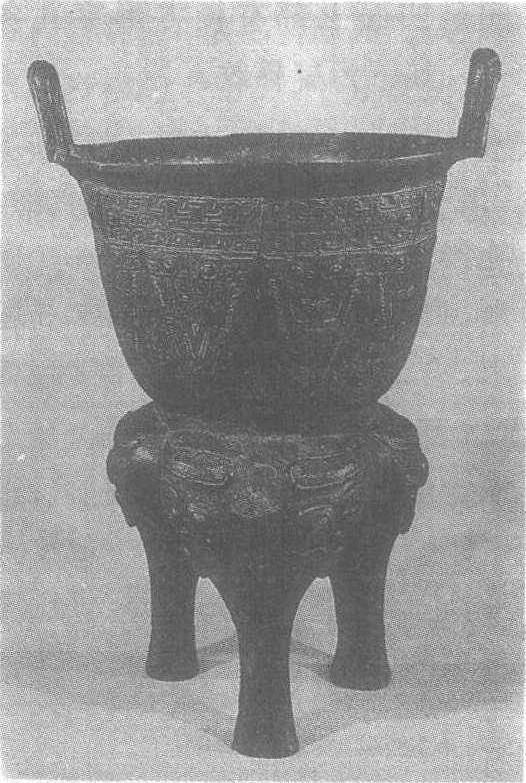 商。炊器。通高44.5厘米,口径28.1厘米。台北故宫博物院藏。侈口,近似圆形腹,双立耳,三条中空的分裆兽蹄形足。黑褐色的表面饰满错金银的夔龙、饕餮、蝉和兽面等纹饰,侈华繁缛,绚丽多姿。甗内刻铭文三字。