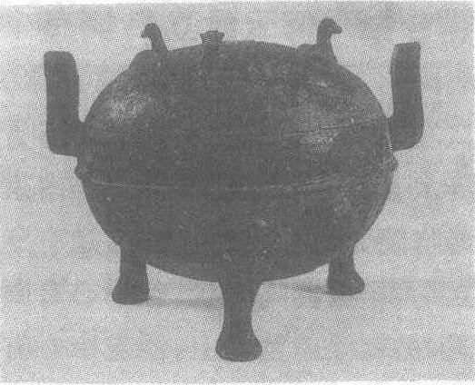 | 释义 | 错金银蟠龙涡云纹铜鼎战国。炊器,礼器。通高15.5厘米,腹径18厘米。1965年江苏省涟水县三里墩西汉墓出土。南京博物院藏。此鼎有附耳一对,圆腹,三蹄足。有盖,盖与器身为子母口,盖钮为卧兽形,盖中心有错金漩涡纹及错银蟠龙纹,其两龙躯体交缠于两兽钮之间,首尾相衔,生动形象。腹部饰错银云纹和三角云纹。凸棱以下,还有六组错银垂花卷云纹,纹饰组合新颖大方。