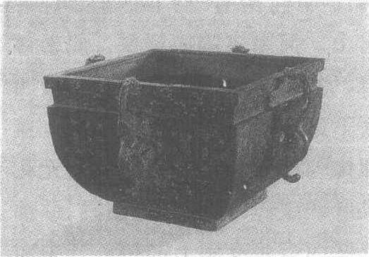 | 释义 | 错金龙耳铜方战国。高21.6厘米,口长、宽皆为30.1厘米。1975年河南省三门峡市上村岭出土。河南省博物馆藏。《说文解字》:“鑑,大盆也。”在铜镜尚未普遍使用之前,鑑可以盛水照影。《庄子·则阳》:“灵公有妻三人,同鑑而浴。”说明鑑又可以用来沐浴。《周礼·凌人》郑玄注:“鑑……以盛冰,置食物于中,以御温气。”这说明鑑又能为食物降温,起保鲜的作用。此鑑作方斗状。方口,口沿内折,方唇,短颈内敛,腹壁向器底斜缩,下为方形圈足。鑑口沿和颈部有错金嵌绿松石的复合菱形图案。鑑腹外壁以勾连纹隔成方栏,栏内有错金嵌绿松石方形和菱形几何图案。四壁各有一龙形耳,铸造极精。龙躯体卷曲伏卧,头部攀缘于器口作探水状,头部和四肢铸出几何形和圆点纹,身上嵌有绿松石构成的花纹。整个器物花纹精细,构图工整。此器的错金方法是:将金丝盘填于纹饰之内,然后加以压打,使其固定填嵌于空隙之间,金丝盘得非常整齐,器表磨错平整光亮。像这样精湛的错金技术,可以代表战国时代错金镶嵌工艺的新成就。出土时,罍内置错金蟠螭纹铜方罍,罍内附一提勺,与湖北省随县曾侯乙墓冰(或温)酒器情况相同,因此知其用途当作冰酒或温酒之用。