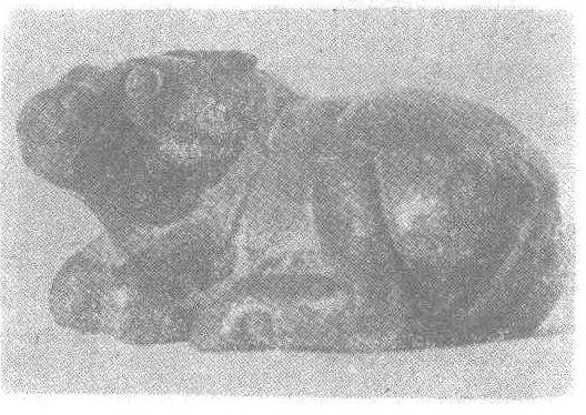 汉。通高4.5 厘米,长6厘米,宽3厘米。1972年陕西省安塞县桥坪村出土。此卧牛身上肌肉突出,前胸、后臀丰满,尾巴卷曲于身底,犄角短小。通身有银质斑点,系嵌入银丝,经过磨制而成。此器可能是一件汉代手工艺品。