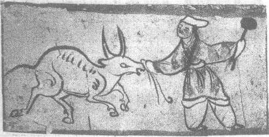 | 释义 | 锤牛图砖画西晋。纵17厘米,横36厘米,甘肃省嘉峪关市新城6号墓前室东壁砖画。图中一个屠夫拽着一头小牛,他一手紧贴着牛的鼻子牵住缰绳,一手高举大锤准备狠击牛的头盖骨。那只倒霉的牛可能已被砸了一锤,负痛哀叫着,眼睛血红,四蹄痉挛,后背弓起,欲向后退。但鼻子却被紧紧牵住,样子十分可怜。双方互相较着力,屠夫被拉得身体倾斜欲倒,但脸上却是一副满不在乎的表情。图中牛与屠夫的神态被刻画得极为生动,体现了作者高超的表现技法。