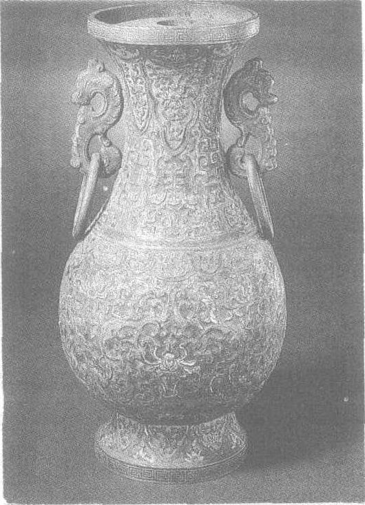 清乾隆。高29厘米,口径10.5厘米,足径11厘米。北京故宫博物院藏。瓶为银胎镀金。圆形,鼓腹细颈,圈足。两侧饰夔凤衔环耳。通体锤揲而成,施以半透明珐琅。腹部饰宝相花,颈部饰下垂蕉叶一周,间以二寿字。此瓶为佛堂供器之一,广州制造。