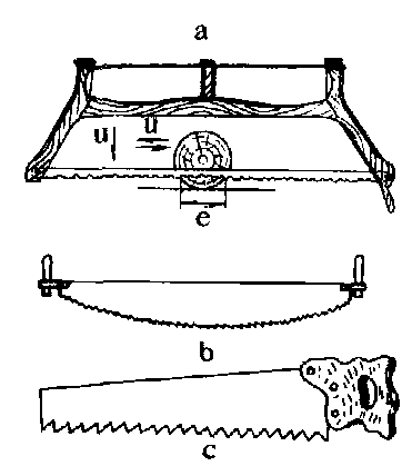 | 释义 | 锯saw用于切割木材的多刃切削工具。锯的历史悠久,可上溯到旧石器时代。锯的制做由于时代、地理环境不同,用料亦异,有石、骨、蚌、铜、铁、钢、合金等。中国考古发掘出古代锯有山西下川石锯(图1 a)、浙江河姆渡骨锯(图1 b)、山东城子崖蚌锯(图1 c)等。《天工开物》载:“凡锯,熟铁锻成薄片,……用鎈开齿,……齿钝之时,频加鎈锐。”进入14世纪初叶,世界上出现机械锯,1348年以风力或水力为动力的框锯在德国诞生,1777年荷兰发明圆锯,1808年英国发明带锯。中国机械锯的使用始于1898年。