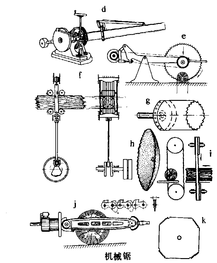 图1 古代锯 锯的种类 现代锯大致分为手工锯和机械锯(图2)两大类。按形状有长形锯、圆形锯、筒形锯、碟形锯、方形锯、带形锯、链形锯;按锯割方向有纵割锯、横