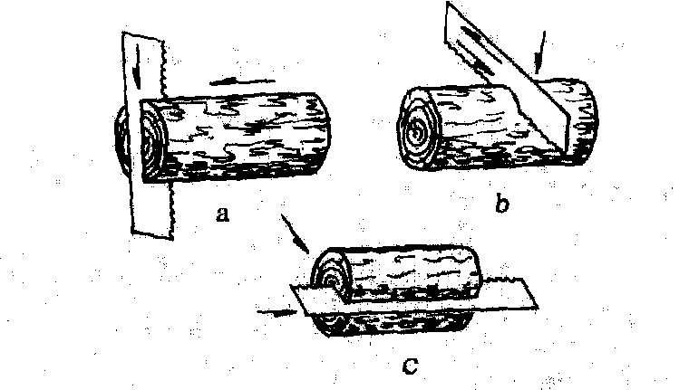 图2 现代锯 锯割形态 锯割时每锯齿为一基本切刀, 被切掉的一部分木材是锯屑, 同时形成锯槽(又称锯路), 锯槽的两个侧面是被切的材面, 暂时未被切开的面称锯槽底。锯割时, 进给与切削方向对木材纤维方向的角度关系是复杂的。可分为: 纵向锯割(图3a), 进给方向平行于纤维方向, 各锯齿似多把凿子排列起来;横向锯割(图3b)切削方向垂直于纤维方向, 各锯齿似多把刀子排列起来; 横向纵割(图3c)进给方向垂直于木材纤维方向, 切削方向平行于木材纤维方向,各锯齿似多把刨子排列起来。