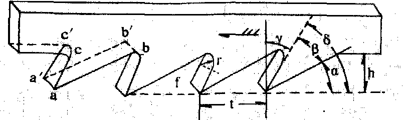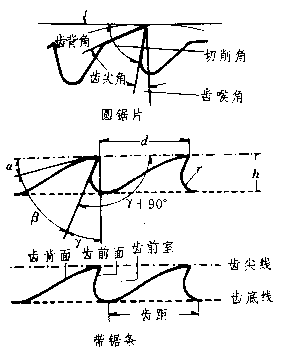 | 释义 | 锯齿saw teeth锯身边缘构成切削部分的每个切刀。每个锯齿是一个基本切刀,其几何形状如图1。aa′、cc′面是锯齿前面,称“齿喉”,aa′、bb′是锯齿后面,称“齿背”,cab或c′a′b′面是“锯齿侧面”,aa′缘是锯齿“前切刃”, ac或a′c′缘是锯齿“侧切刃”。由齿尖构成的直线(在圆锯上是过齿尖的切线)和齿背线的夹角,称“齿背角”(α)。齿背线和齿喉线的夹角,称“齿端角”(β)。齿喉线和垂线(在圆锯上指半径)的夹角,称“齿喉角”(γ)。齿背角与齿端角之和称“切削