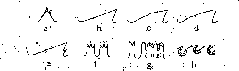 图1 锯齿几何形状 角”(δ),即α+β=δ。相邻两个齿尖之间的距离是齿与齿间距离,称“齿距”(t)。两齿间能容纳锯屑的空当称“齿仓”(f)。由齿仓底到齿尖的直线距离,称“齿高”(h)。齿仓底部的圆弧形半径,称“齿仓半径”(r)。齿型 锯割木材用的锯,受木材各向导性特征的影响,齿型基本分为纵割与横截两大类。常见齿型见图2。三角型,齿喉角为负值,属典型横截锯齿;直背型,是中国制材工业中常见者,适宜锯割中等材,不太适宜锯割硬质材或冻材;折背型,齿背由两条直线构成,强度较大,宜锯割硬质材或冻材,不易错磨;凸弧型,齿背是一条凸弧形曲线,强度大,适于锯割硬质材和冻材;M型,多用于往复式手工截锯,适于造材和截断大方材;双刃型,在大齿下面另有一个小齿,起断屑作用,专用于寒带锯割冻材;组合型,由纵割与横截两种齿组成齿组,俗称锯刨联合锯机,锯割表面光洁;嵌齿型,齿尖由硬质合金钢或其他特殊硬化材料制成。 参数 锯齿的几何参数对锯齿强度、锯割质量、生产效率、能耗、产品质量与适应锯割的树种有关。齿背
