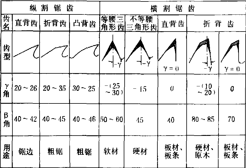 图2 常见齿型 a.三角型; b.直背型; c.折背型; d.凸弧型; e.双刃型; f.M型; g.组合型; h.嵌齿型角α大小与齿背同木材间的摩擦大小成反比关系;齿端角β大小与锯齿强度成正比关系;齿喉角γ大小与切削功率成反比关系。锯齿各角度的关系是α+β+γ=90°。带锯常见角度参数是: 冬季或割硬材时α角为25°~40°,β角为30°~40°,γ角为20°~25°,锯割混合材时α角为20°~22°,β角为40°~41°, 圆锯齿各角度参数表