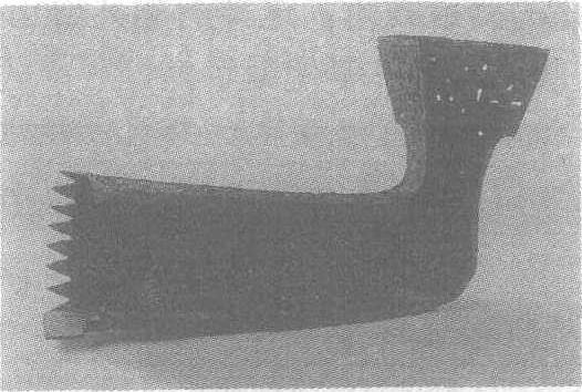 战国。高38厘米,通长62厘米。1972年江苏省沙洲县鹿苑出土。南京博物院藏。此器中空,似斗拱。方斗一侧饰镂空蟠螭纹,另一侧的末端有锯齿七个。器身中部有圆形钉孔,亦饰蟠螭纹。用途不明,可能为建筑物构件或车器上的金釭。