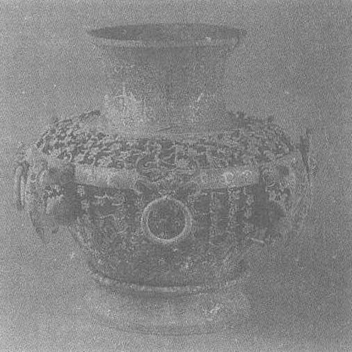 | 释义 | 镂空错金银网云纹刻铭铜壶战国。古代盛酒器。通高24厘米,口径12.8厘米,腹径22.2厘米,圈足径13.8厘米。重6.25公斤。1982年江苏省盯眙县南窑庄出土。南京博物院藏。此壶为侈口,束颈,弧肩,收腹,平底,圈足。颈部较肩部高出一层,形成一周凸面。外套由肩腹两组立体形镂空的铜丝网套、肩腹之间的一圈横箍和镂空花纹底的圈足座组成。外露的器身颈部和圈足座缘,饰有错金的斜方格云纹图案。由铜丝网套罩着的器身肩腹部则饰有错银的斜方格云纹图案。肩腹部的铜丝网套,系由蜷曲起伏的长龙和梅花钉交错套扣而成。肩部的铜丝网套为头尾交错的48条长龙,每条龙起伏蜷曲三次,相间的两龙于蜷曲处相接,皆以梅花钉连接。每条龙经过六枚梅花钉,肩部的梅花钉为48竖行,每行三枚,共144枚。腹部的铜丝网套,亦为头尾交错的48条长龙,每条龙起状蜷曲九次,相间的两龙于蜷曲处相接,亦皆为梅花钉连接,每条龙经过18枚梅花钉,腹部的梅花钉亦为48竖行,每行九枚(下部锈蚀脱落四、五枚),共432枚。整个铜丝网套,共由96条长龙,576枚梅花钉,精心编缀浇铸而成。这种立体镂空的以长龙套扣、用梅花作为装饰题材的青铜器,在考古中尚属首次发现。肩腹之间的一圈横箍上,饰错金的流云纹饰,相间饰有兽面衔环和立兽形竖环耳各四个。兽面的额上镶嵌绿松石(皆已脱落),两侧细刻双龙为饰,衔环上有细如发丝的错金流云纹饰。立兽作虎形,通体为错金银纹饰。铜壶的壶口内沿和圈足外缘皆刻有篆体铭文。壶口内沿铭文为“廿五重金壶(容)一五𥾷(升)”十一字。“廿五”指楚汉制25斤,折合公制为6250克,则每斤重为250克。该壶实测为3000毫升,按每升为200毫升折算,容量为十五升,即一斗五升,“”可能即为“斗”的异体字。圈足外缘铭文20余字,刻划浅,多锈蚀,仅“陈”、“釴”(铁)、“宫”、“之”四字可辨。该铜壶制作精美绝伦,造型独特,当为战国时期楚国遗物,应是楚国王宫使用之物,是一件量器。铜壶上记载的重量和容量,为研究楚国的度量衡,提供了新的实物例证。