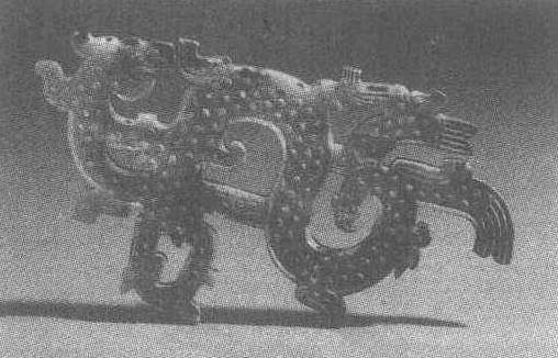 | 释义 | 镂空龙形玉佩战国晚期。高11.5厘米,长21.4厘米,厚0.9厘米。1977年安徽省长丰县杨公乡墓葬出土。安徽省博物馆藏。以黄玉琢制,上有褐色浸蚀痕。体扁平,龙体镂空成S形,回首后望。其风格已与商周时代的龙大为不同,眼为椭圆形,上唇长,下唇短,龙角似耳。身体两面纹饰相同,饰凸蚕纹,颈及尾各立一鸟。与此佩同时出土的另一件龙形玉佩形制类似。